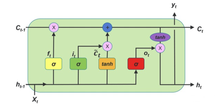 理解了三个门后,再看图中间部分就清晰了:首先,遗忘门的输出与旧的记忆相乘,丢弃无用部分;接着,输入门的输出与候选记忆相乘,筛选出新信息;最后,将这两部分相加,就得到了更新后的、全新的细胞状态 。这个“乘法遗忘 + 加法更新”的组合,是LSTM能保护梯度、维持长期记忆的数学关键。