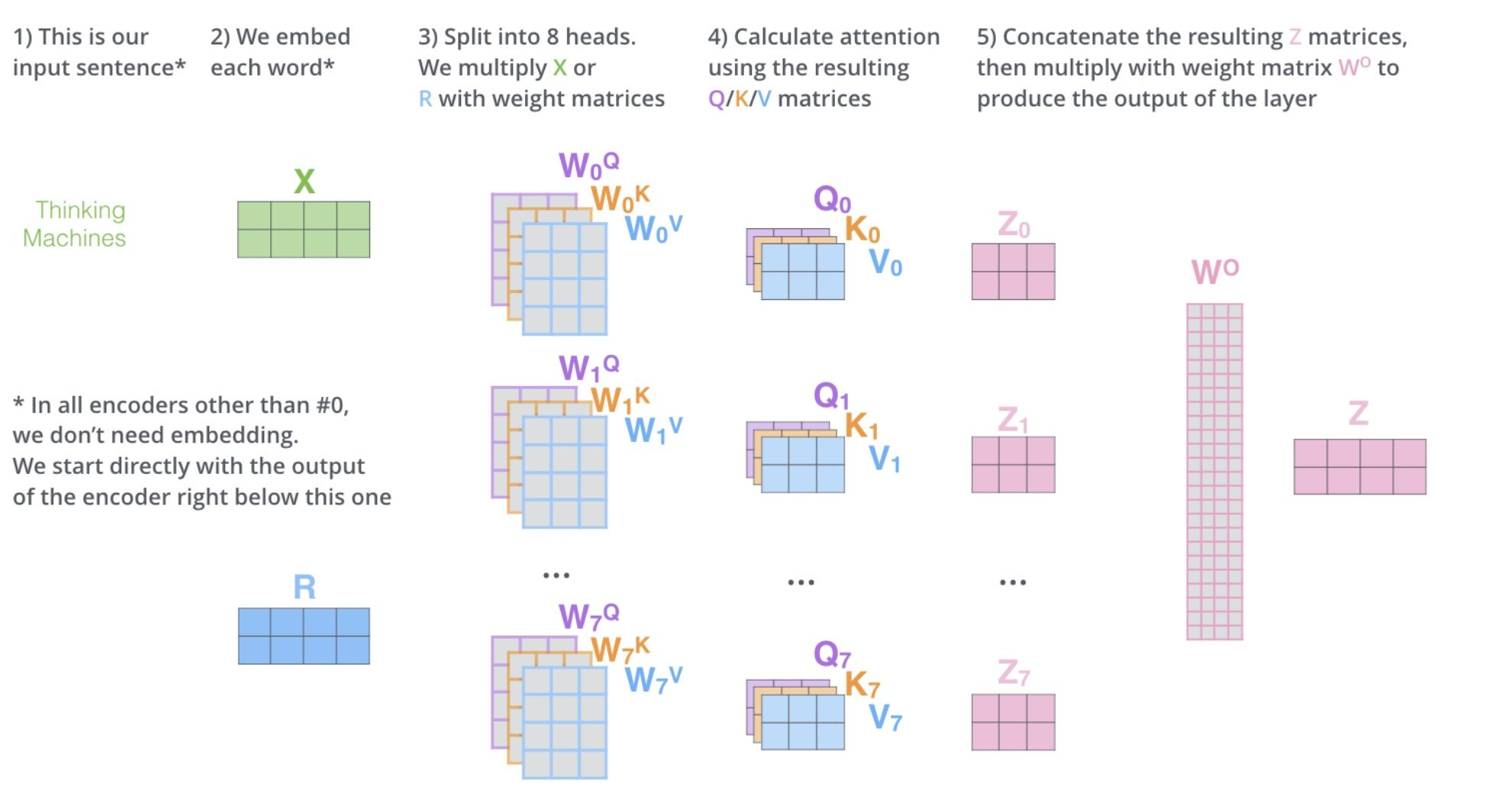 如图所示,对于每个“头”(Head,图中以8个头为例),我们都准备三套独立的权重矩阵:,,。