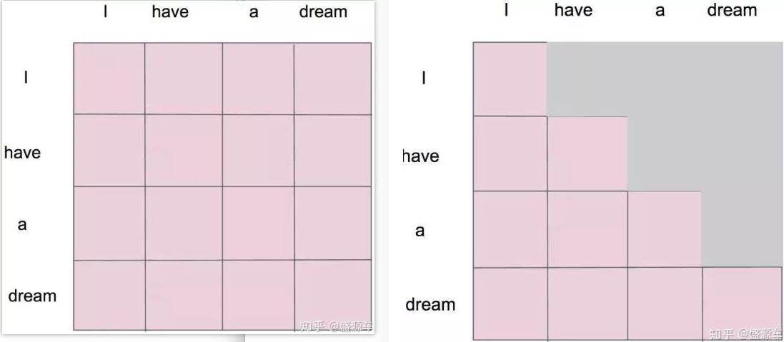 左侧(标准自注意力):注意力矩阵全亮,意味着单词“I”可以看到包括未来词“have”, “a”, “dream”在内的所有信息。