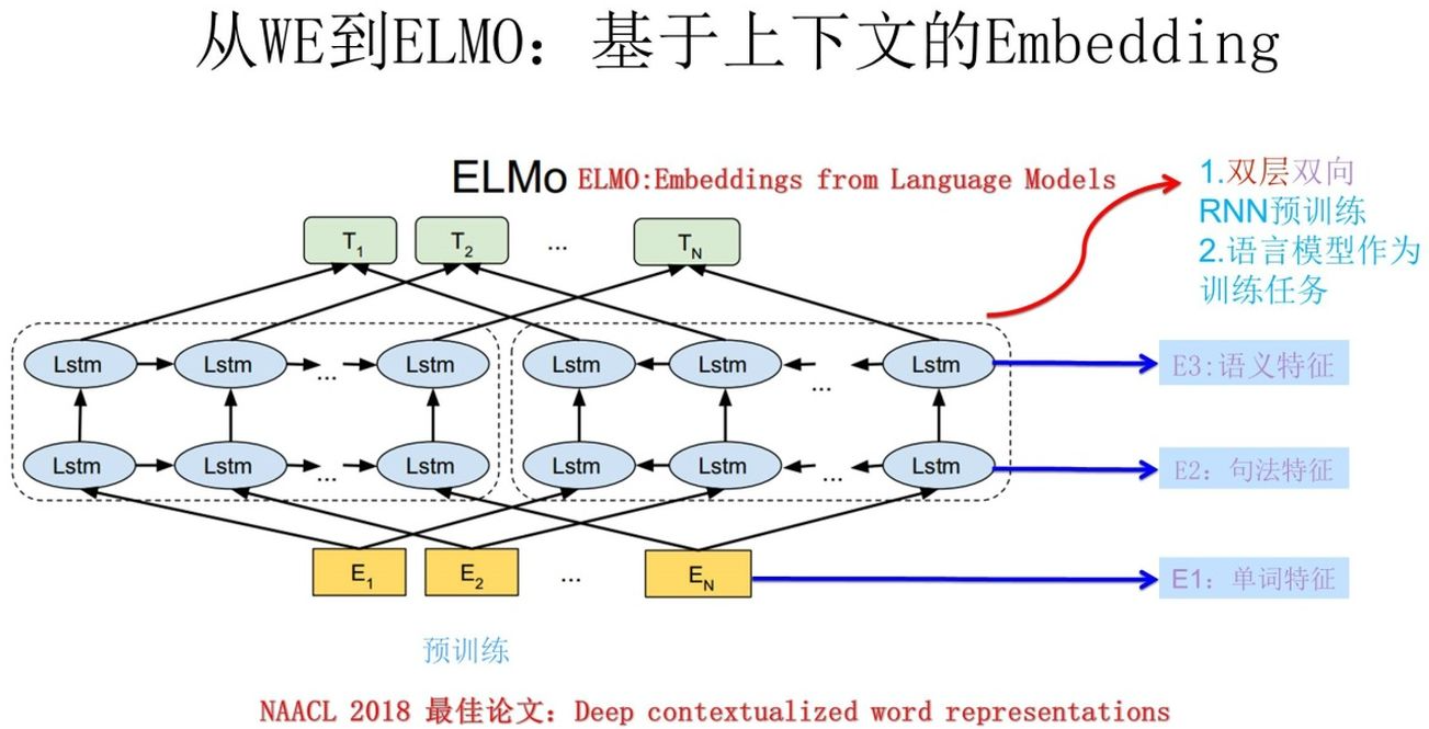 ELMo使用一个双层双向LSTM网络作为核心架构,在大规模文本上进行语言模型任务的预训练。