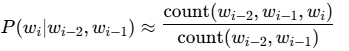 其中,条件概率 P(wi∣wi−2,wi−1)可以通过语料库中出现的频率来估算: