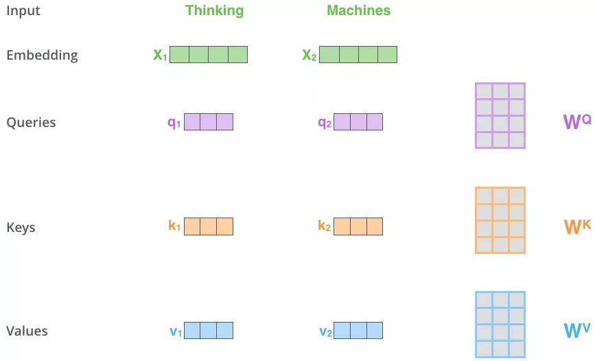 输入序列中的每个词(如 Thinking, Machines)首先被转换为词向量(即 x₁, x₂)。接着,这些词向量会分别与三个可学习的权重矩阵( , , )相乘,从而派生出对应的查询向量(q₁, q₂)、键向量(k₁, k₂)和值向量(v₁, v₂)。
