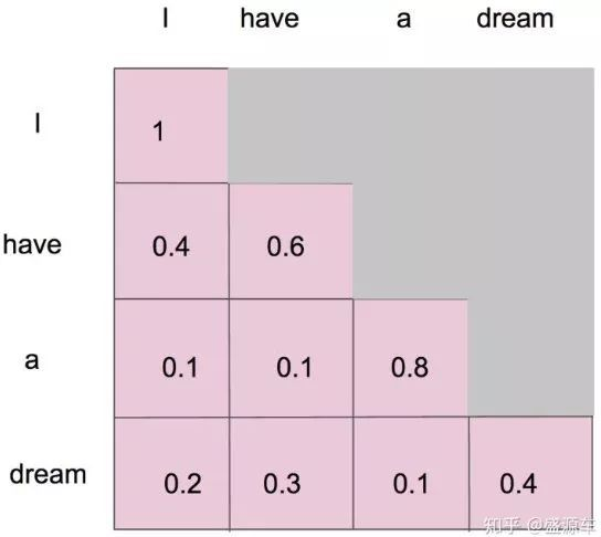 第三个词 “a”:可以看到“I”、“have”和自己(权重分别为0.1, 0.1, 0.8)。