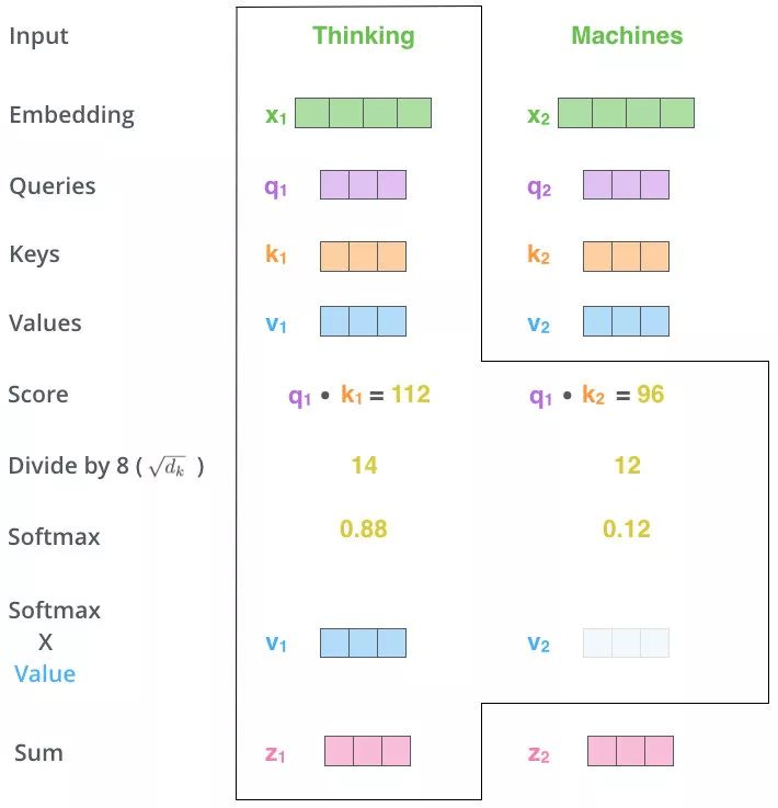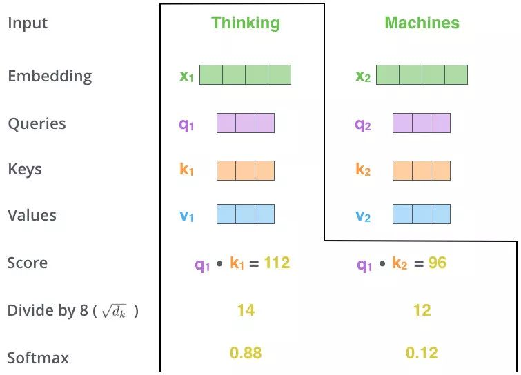 q₁分别与“Thinking”自己的键向量k₁和“Machines”的键向量k₂进行点积,得到两个原始分数(112 和 96)。这衡量了“Thinking”与每个词(包括自己)的相关性。缩放:为防止点积结果过大导致梯度不稳定,将分数除以键向量维度的平方根(此处 =64),得到缩放后的分数(14 和 12)。