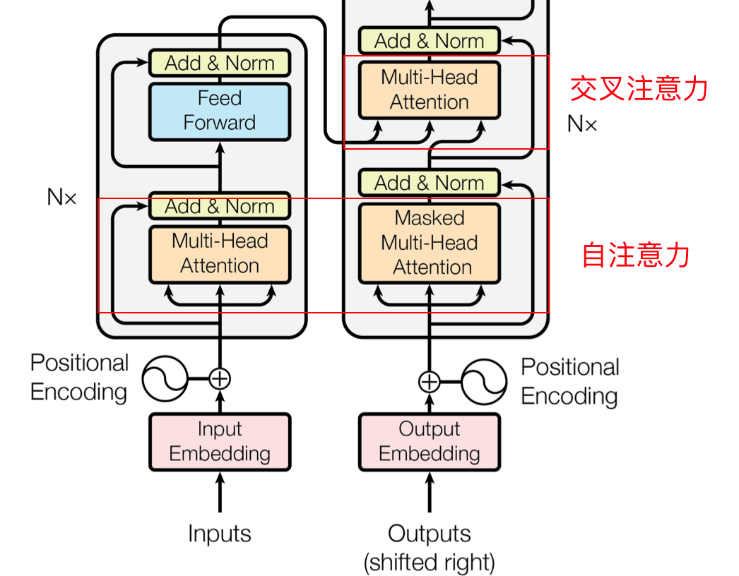 在transformer当中,我们可以把注意力机制区分为自注意力和交叉注意力机制,如图所示。显而易见,自注意力机制当中的q,k,v均来自自己,也就是 q=k=v,而交叉注意力机制的 q≠k=v,这就是二者的差异